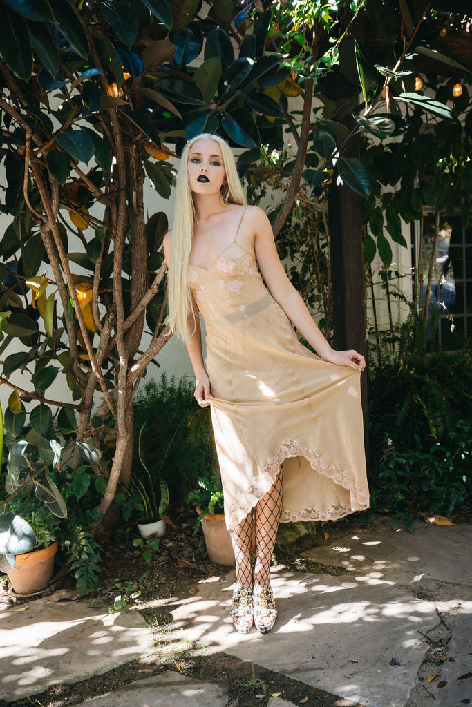 The floral appliqué at the bust and hem adds soft, dreamy texture, while the long, semi-sheer column shape drapes delicately along the body. This is the quintessential Uptown Girls slip seen across film moodboards, TikTok aesthetics, and vintage lingerie collectors’ archives.