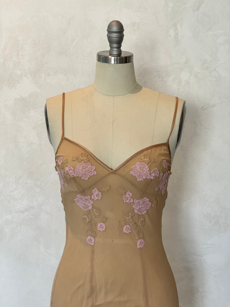 A true Uptown Girls era Victoria’s Secret collectible — the nude mesh slip dress with pink floral appliqué, iconic in early-2000s VS Angel styling. This silhouette is one of the most sought-after vintage VS pieces: sheer, romantic, feminine, and unmistakably Y2K.