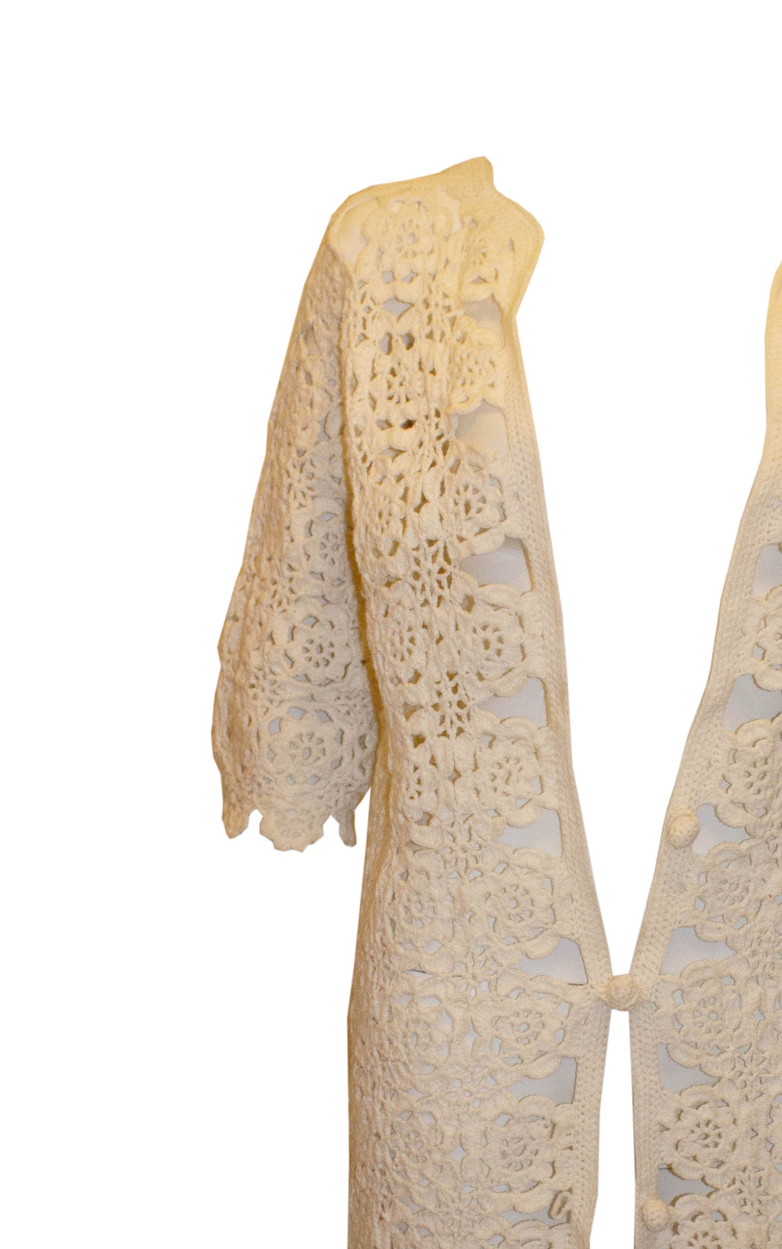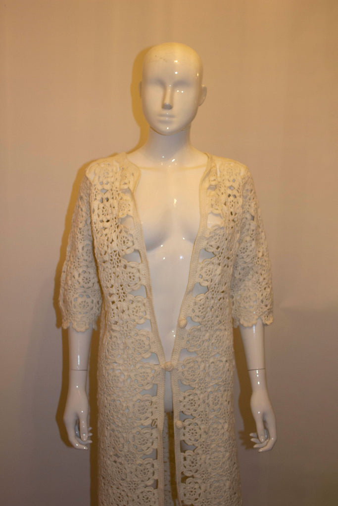 A stunning vintage white crochet coat, ideal for the Summer season, It has elbow length sleaves and a three button front fastening.