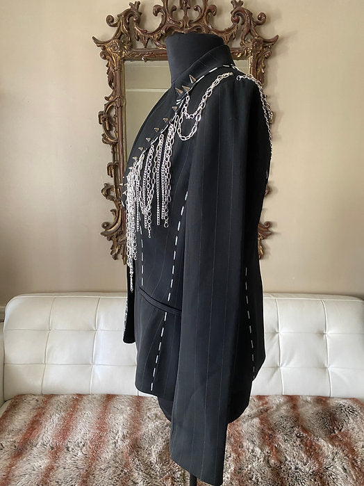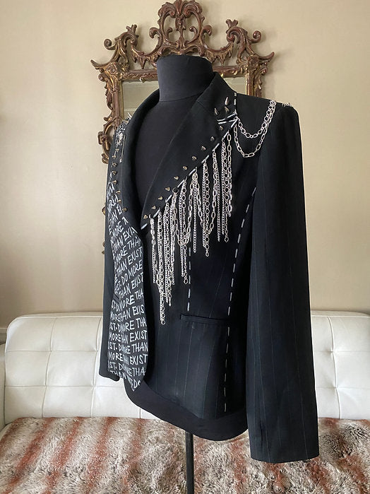 Hand-painted women’s punk-inspired suit jacket with spiked lapels. A classic tailored silhouette transformed into a one-of-a-kind fashion statement. Each jacket is individually upcycled and customized by hand — a refusal of fast fashion and mass production. Size XL, US 12 Women's Suit Jacket with Chains Details• Hand-painted statement• Spiked lapels• Classic tailored suit jacket silhouette• Upcycled / sustainable• Dry clean safe Created in a single size as part of our upcycled collection. Custom commissions are available through our Custom Suit Jacket program:https://punkmajesty.com/pages/custom-suit-jackets Returns are accepted if you notify us directly via email within 7 days of delivery to receive instructions. Items must be returned unworn in original condition, insured with tracking number provided. measurements 19 1/2 inch chest 18 inch waist 24 inch sleeve length 16 inch shoulders 24 inch back length