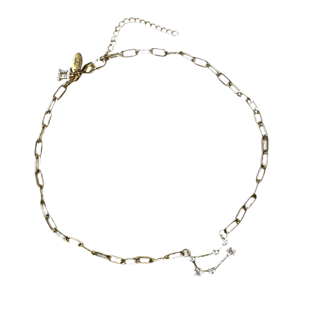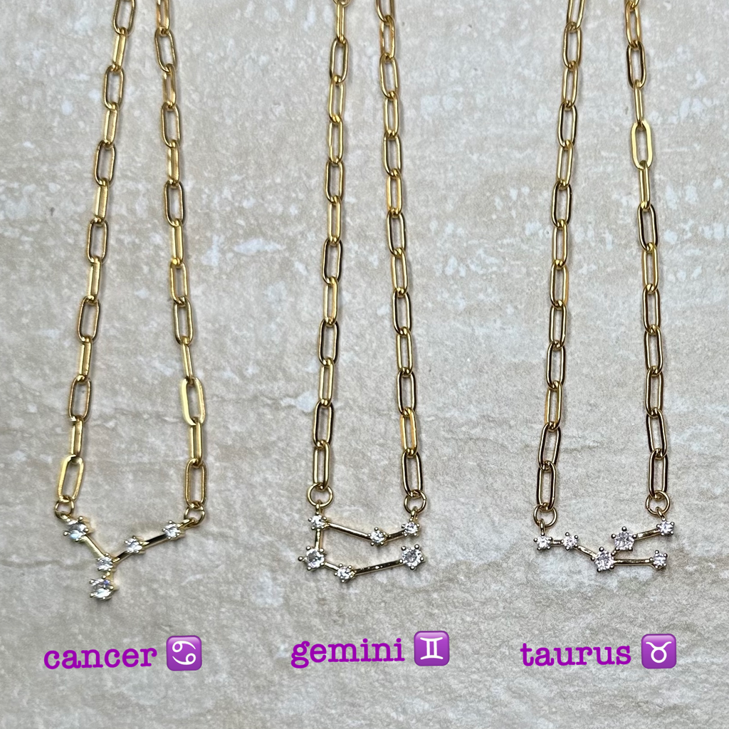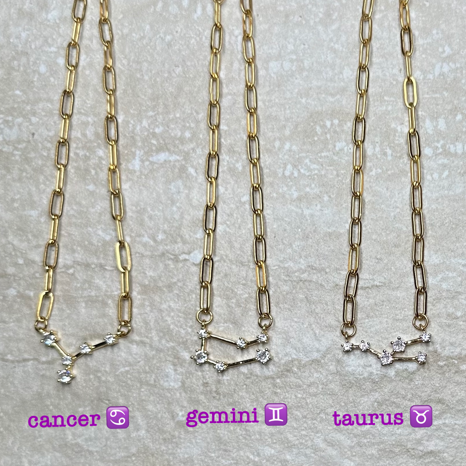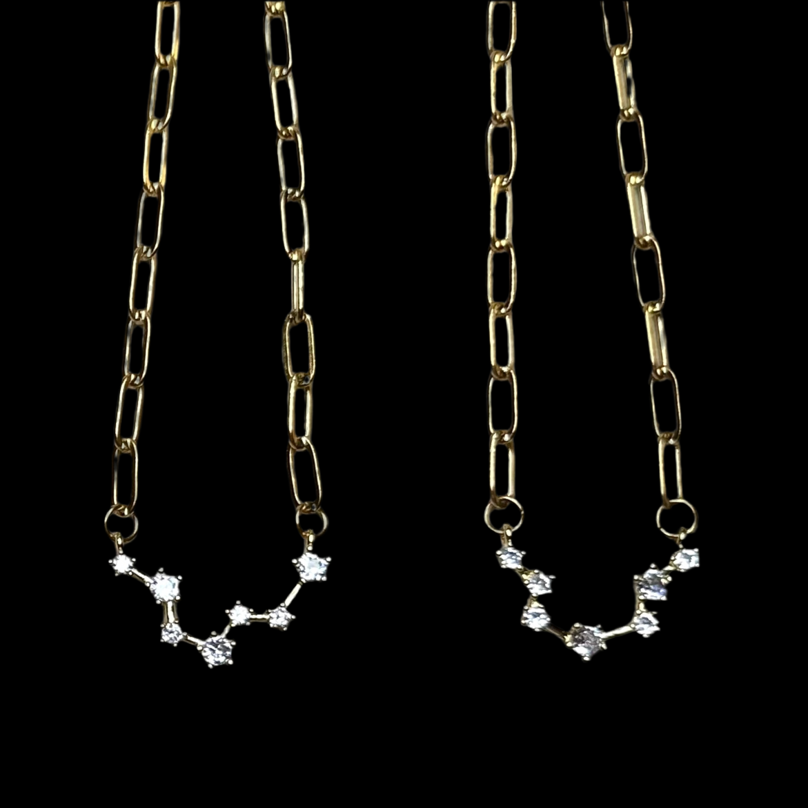 Our stunning Constellation necklaces are handmade from non-tarnish 22kt gold vermeil paperclip chain featuring a beautiful constellation charm in 22kt gold vermeil studded with sparkling CZ stones.