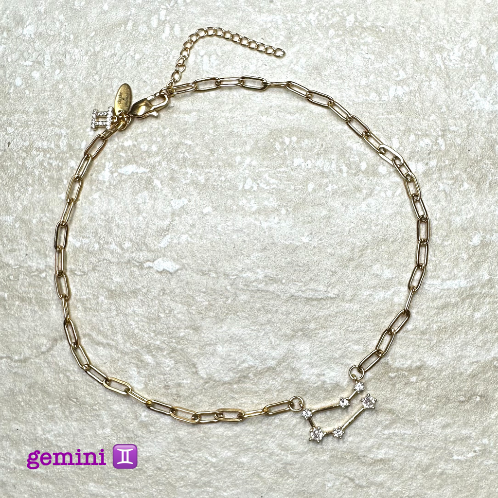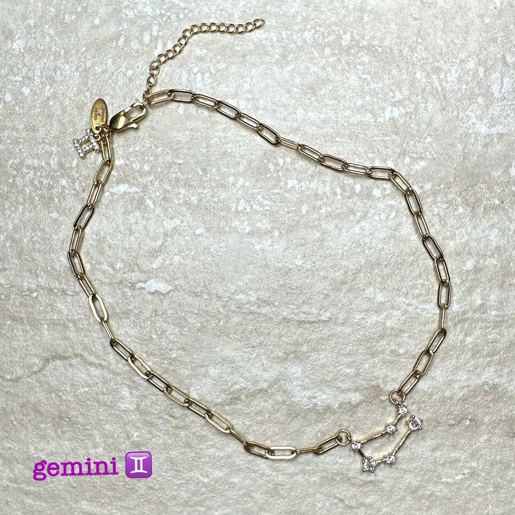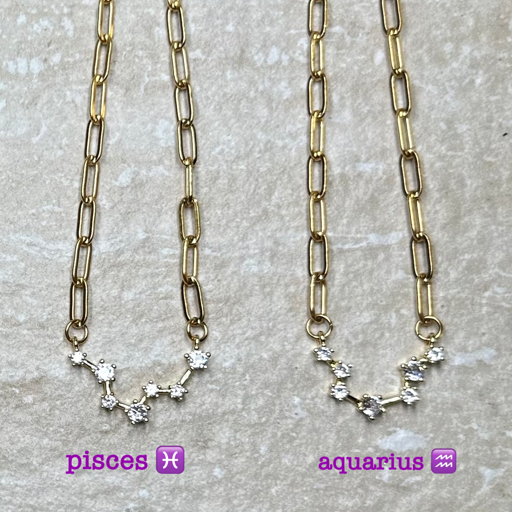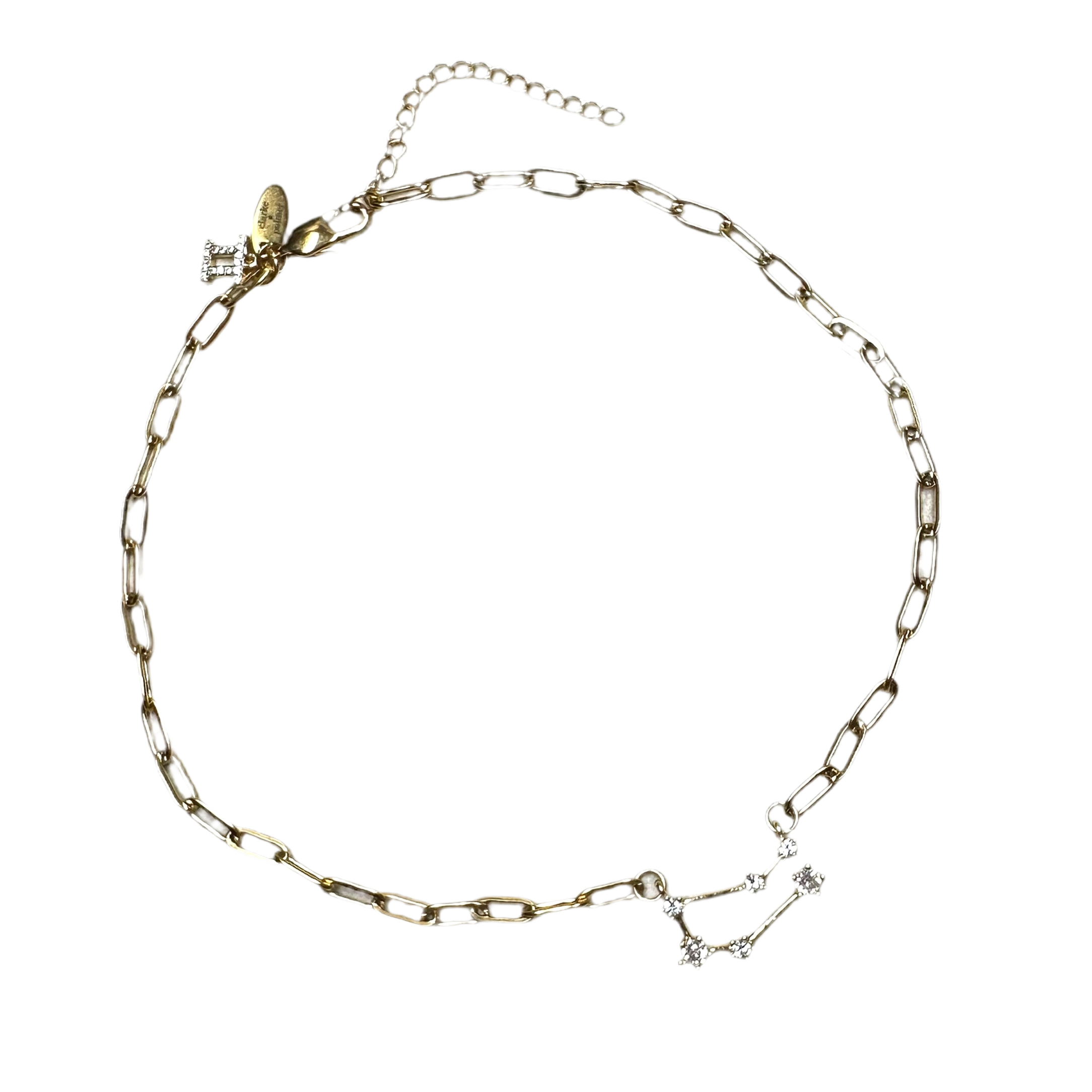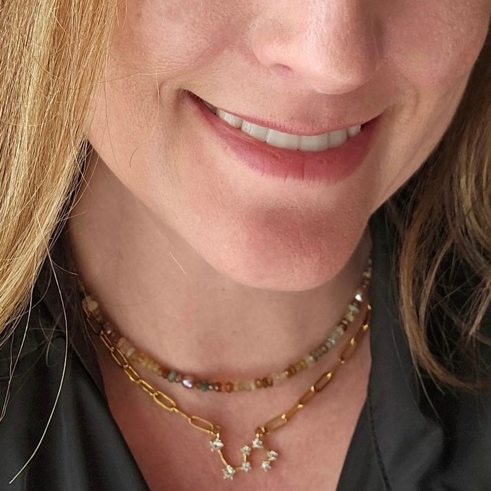Our stunning Constellation necklaces are handmade from non-tarnish 22kt gold vermeil paperclip chain featuring a beautiful constellation charm in 22kt gold vermeil studded with sparkling CZ stones.